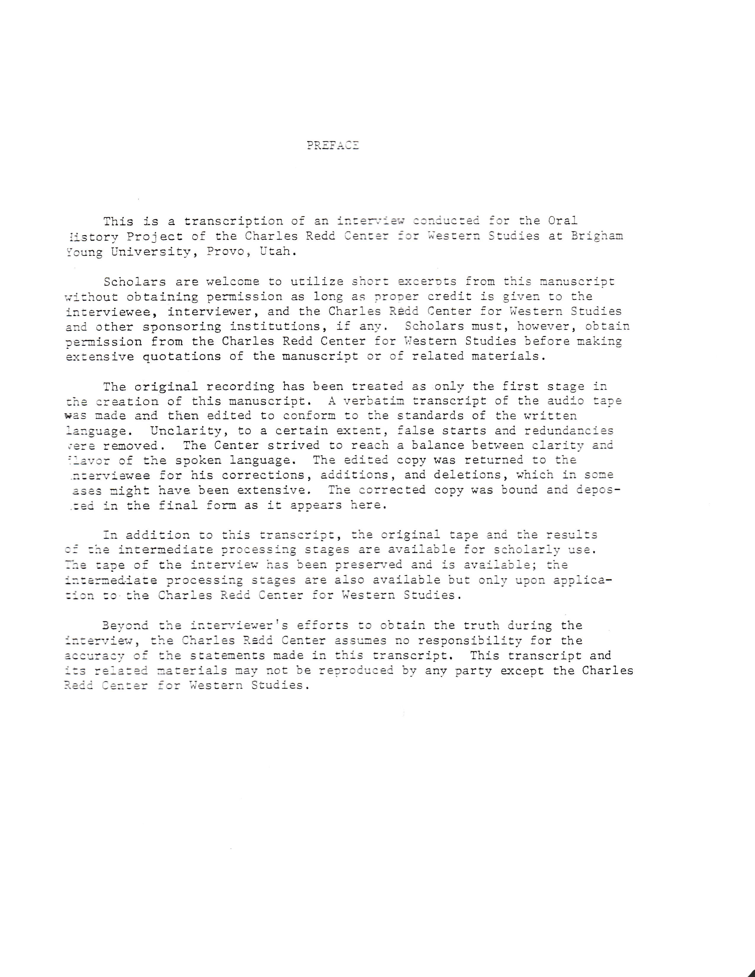 Beyoned the interviewer's efforts to obtain the truth during the interview, the Charles Redd Center assumes no responsibility for the accuracy of the statements made in this transcript. This transcript and its related materials may not be reproduced by any party except the Charles Redd Center for Western Studies.