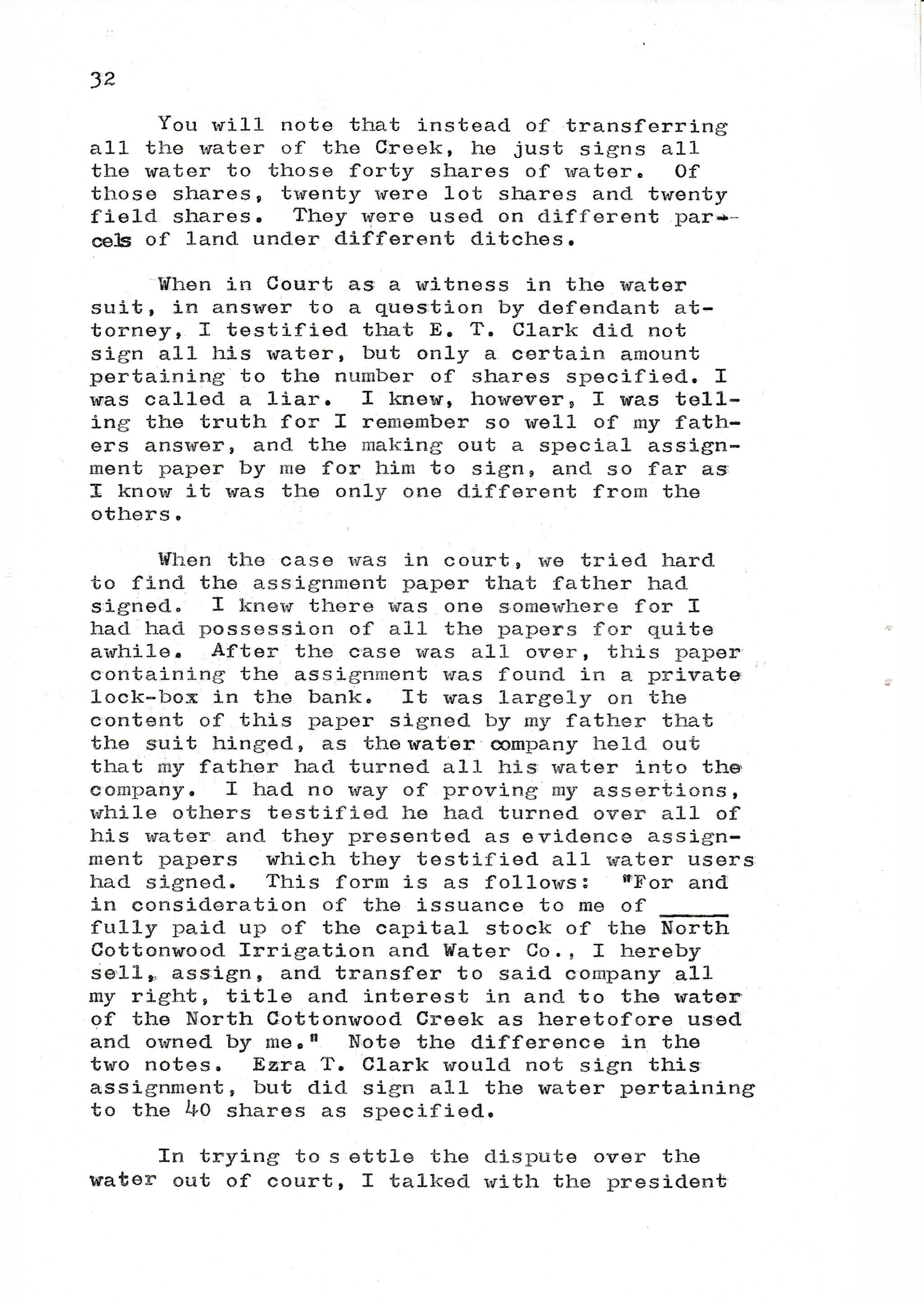 When the case was in court, we tried hard to find the assignment paper that father had signed. I knew there was one somewhere for I had had possession of all the papers for quite awhile. After the case was all over, this paper containing the assignment was found in a private lock-box in the bank. It was largely on the content of this paper signed by my father that the suit hinged, as the water company held out that my father had turned all his water into the company. I had no way of proving my assertions, while others testified he had turned over all of his water and they presented as evidence assignment papers which they testified all water users had signed. This form is as follows: "For and in consideration of the issuance to me of ___ fully paid up of the capital stock of the North Cottonwood Irrigation and Water Co., I hereby sell, assign, and transfer to said company all my right, title and interest in and to the water of the North Cottonwood Creek as heretofore used and owned by me." Note the difference in the two notes. Ezra T. Clark would not sign this assignment, but did sign all the water pertaining to the 40 shares as specified.