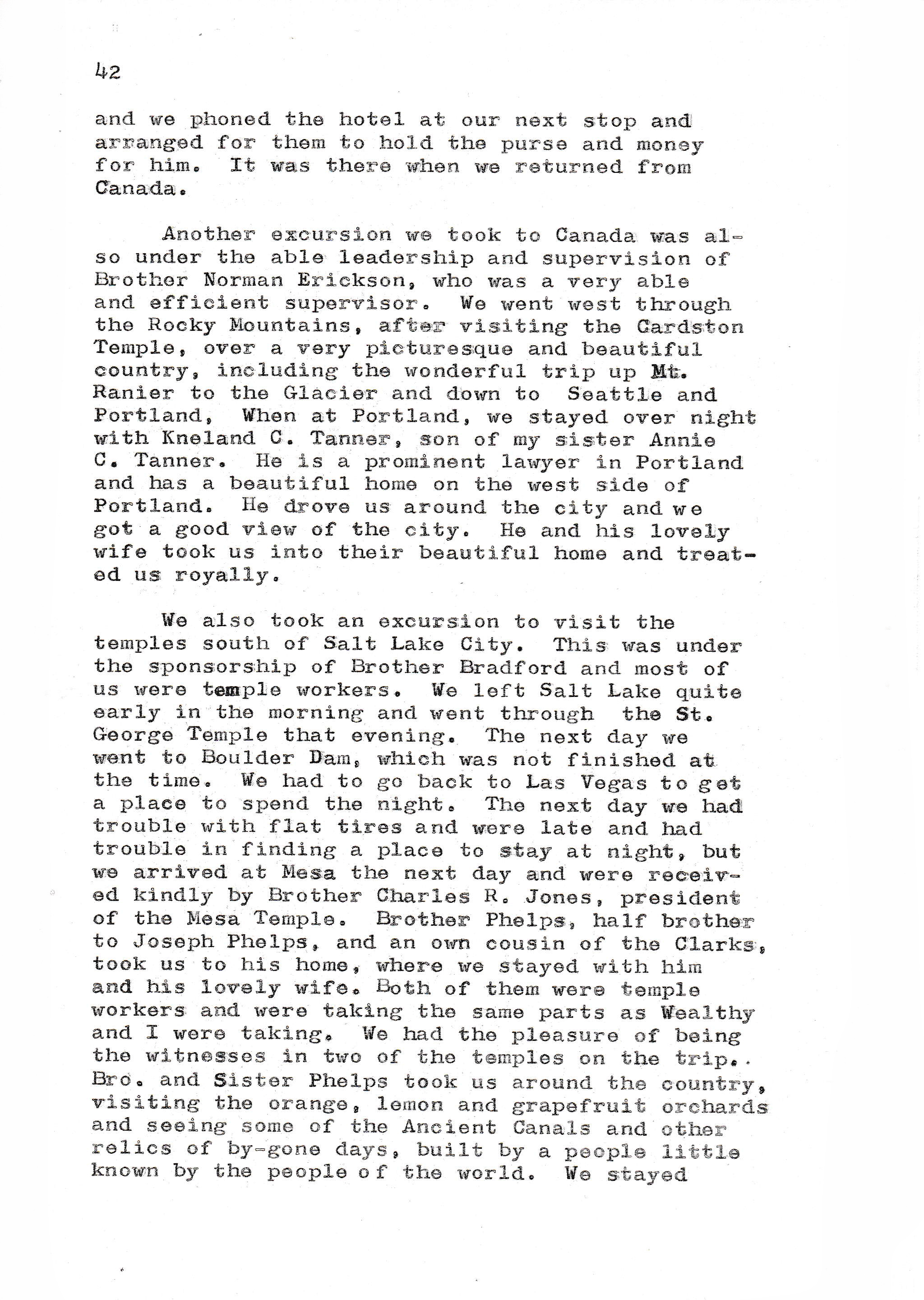Another excursion we took to Canada was also under the able leadership and supervision of Brother Normal Erickson, who was a very able and efficient supervisor. We went west through the Rocky Mountains, after visiting the Cardston Temple, over a very picturesque and beautiful country, including the wonderful trip up Mt. Ranier to the Glacier and down to Seattle and Portland, When at Portland, we stayed over night with Kneland C. Tanner, son of my sister Annie C. Tanner. He is a prominent lawyer in Portland and has a beautiful home on the west side of Portland. He drove us around the city and we got a good view of the city. He and his lovely wife took us into their beautiful home and treated us royally.