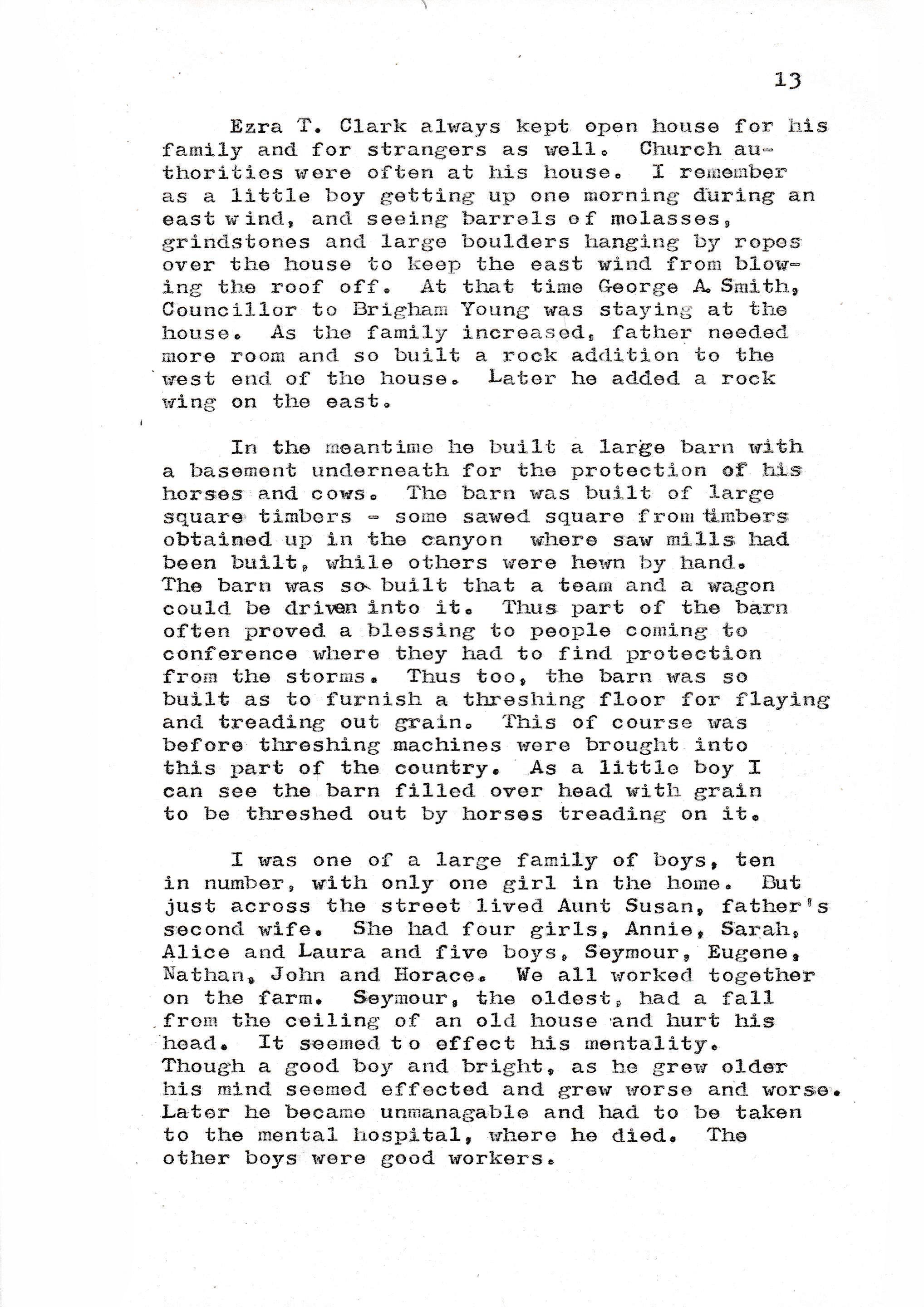 Ezra T. Clark always kept open house for his family and for strangers as well. Church authorities were often at his house. I remember as a little boy getting up one morning during an east wind, and seeing barrels of molasses, grindstones and large boulders hanging by ropes over the house to keep the east wind from blowing the roof off. At that time George A. Smith, Councillor to Brigham Young was staying at the house. as the family increased, father needed more room and so built a rock addition to the west end of the house. Later he added a rock wing on the east.