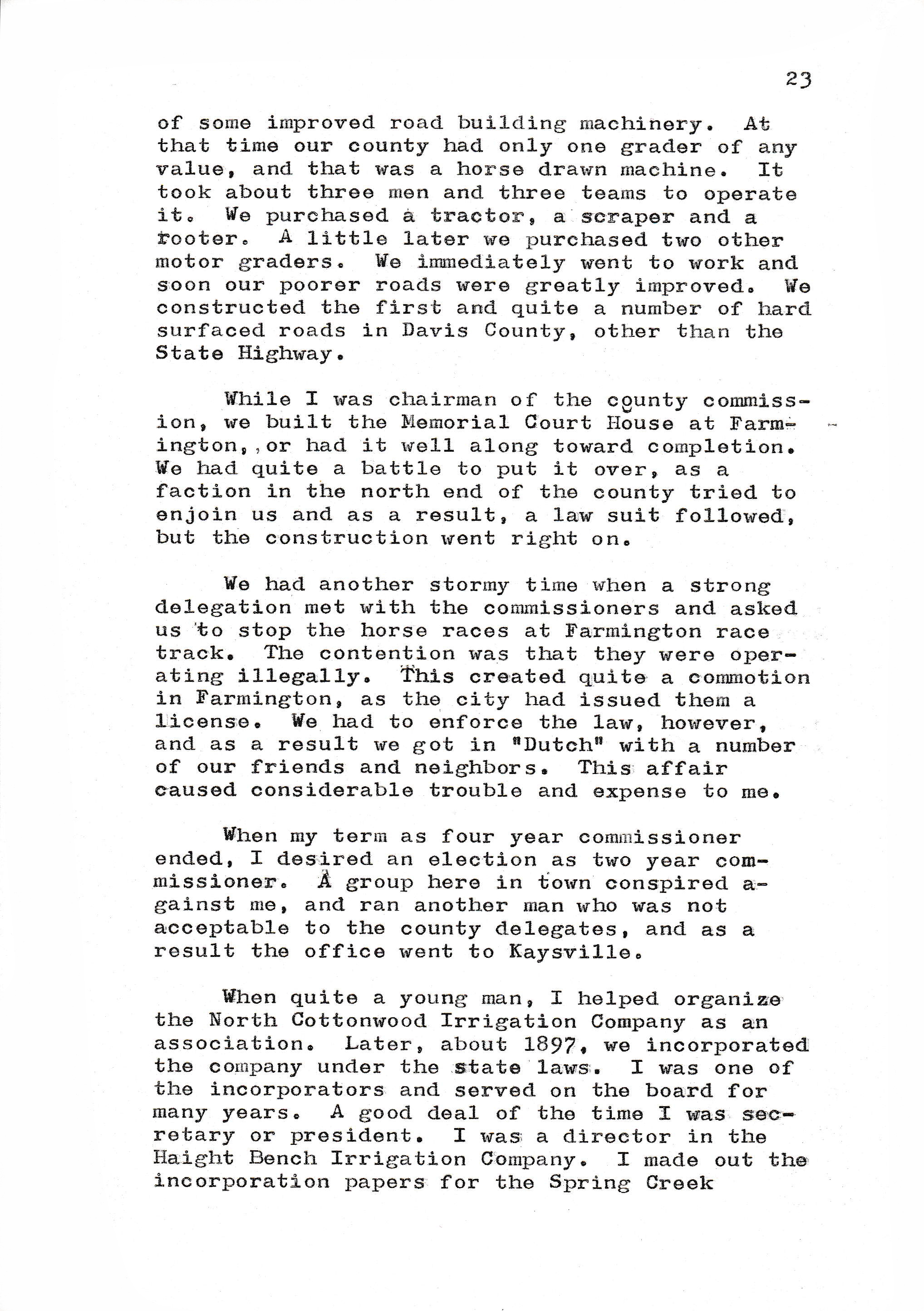 of some improved road building machinery. At that time our county had only one grader of any value, adn that was a horse drawn machine. It took about three men and three teams to operate it. We purchased a tractor, a scraper and a rooter. A little later we purchased two other motor graders. We immediately went to work and soon our poorer roads were greatly improved. We constructed the first and quite a number of hard surfaced roads in Davis County, other than the State Highway.