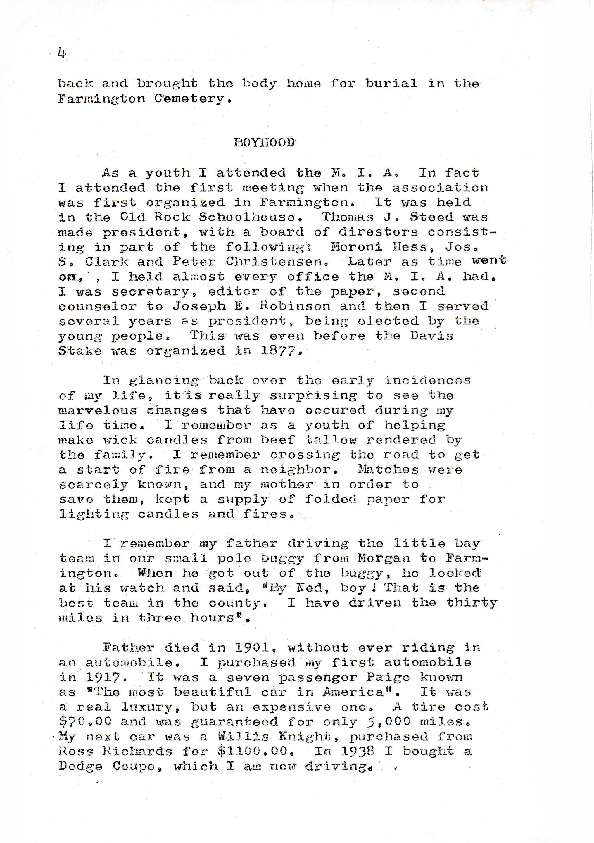 Father died in 1901, without ever riding in an automobile. I purchased my first automobile in 1917. It was a seven passenger Paige known as "The most beautiful car in America". It was a real luxury, but and expensive one. A tire cost $70.00 and was guaranteed for only 5,000 miles. My next car was a Willis Knight, purchased from Ross Richards for $1100.00. In 1938 I bought a Dodge Coupe, which I am now driving.