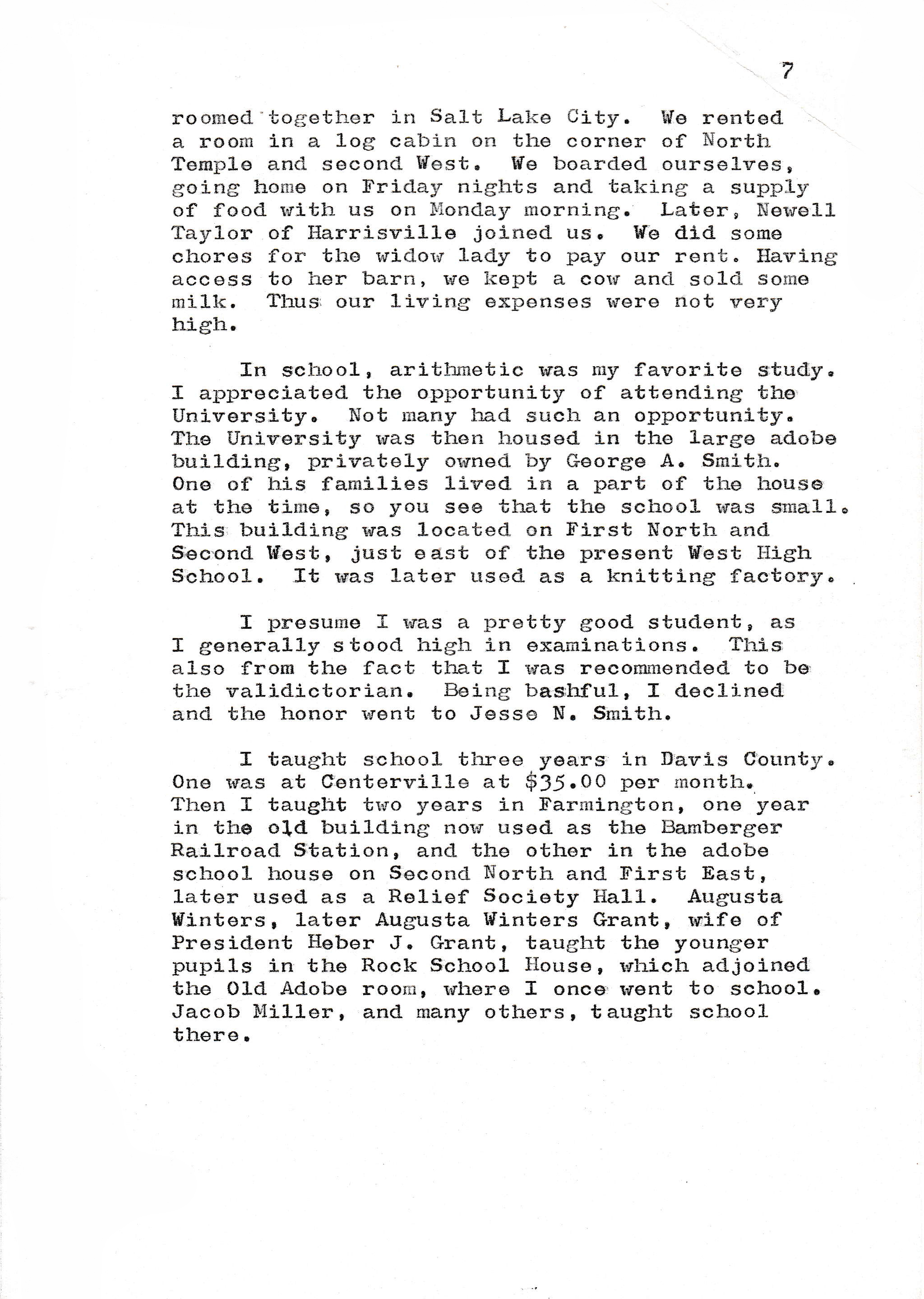 In school, arithmetic was my favorite study. I appreciated the opportunity of attending the University. Not many had such an opportunity. The University was then housed in the large adobe building, privately owned by George A. Smith. One of his families lived in a part of the house at the time, so you see that the school was small. This building was located on First North and Second West, just east of the present West High School. It was later used as a knitting factory.