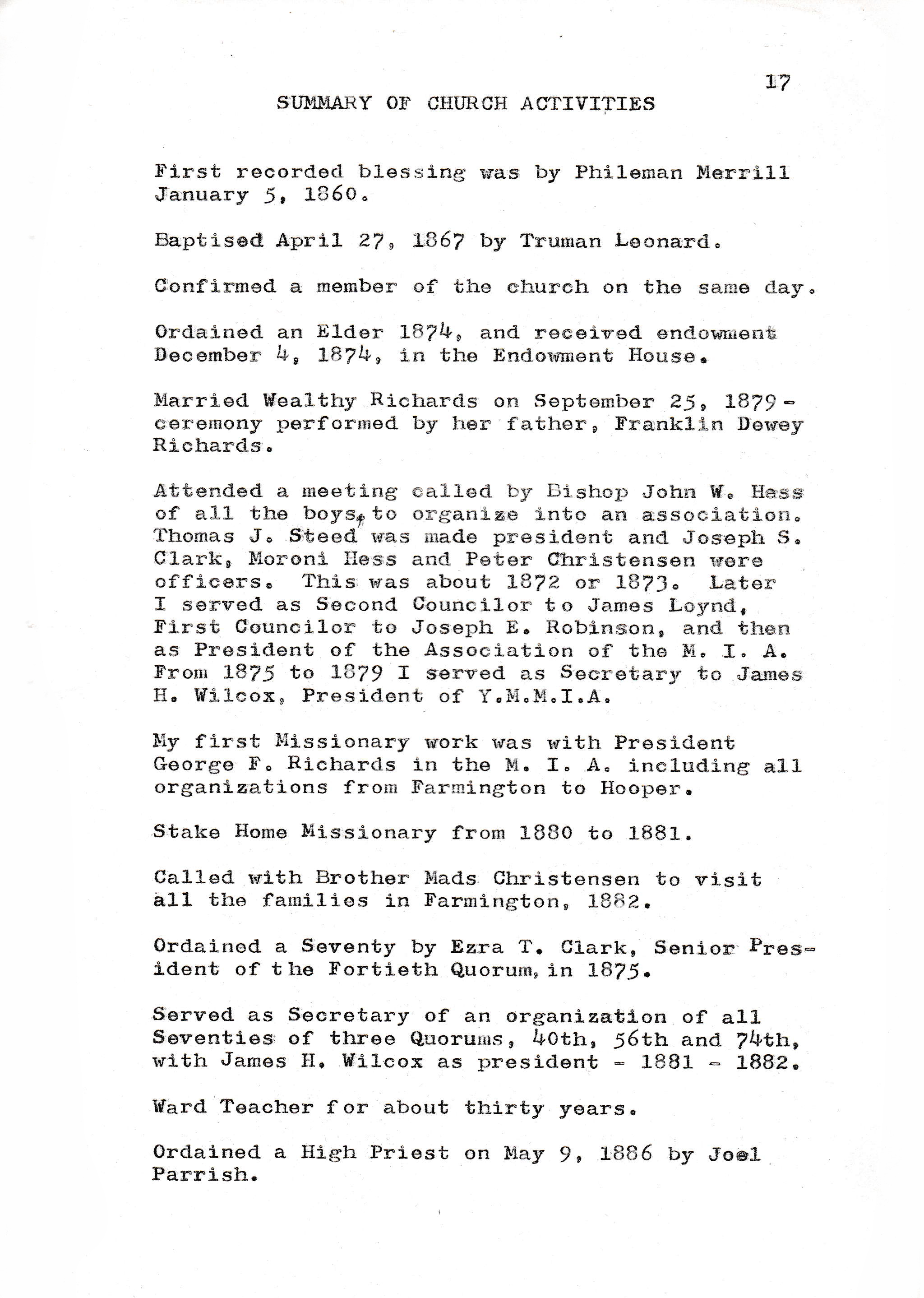 Attended a meeting called by Bishop John W. Hess of all the boys to organize into an association. Thomas J. Steed was made president and Joseph S. Clark, Moroni Hess and Peter Christensen were officers. This was about 1872 or 1873. Later I served as Second Councilor to James Loynd, First Councilor to Joseph E. Robinson, and then as President of the Association of the M. I. A. From 1875 to 1879 I served as Secretary to James H. Wilcox, President of Y. M. M. I. A.