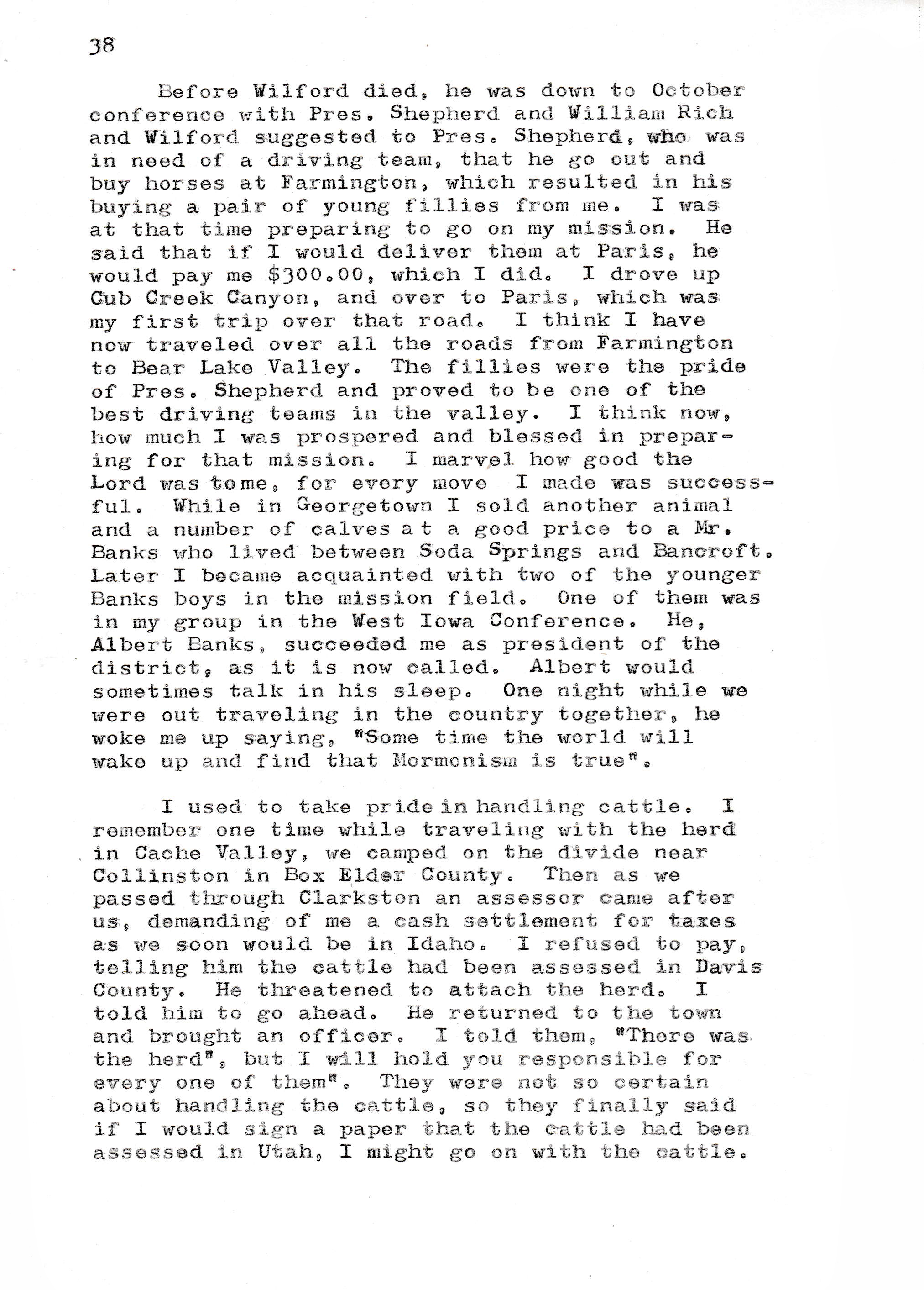 Before Wilford died, he was down to October conference wit Pres. Shepherd and William Rich and Wilford suggested to Pres. Shepherd, who was in need of a driving team, that he go out and buy horses at Farmington, which resulted in his buying a pair of young fillies from me. I was at that time preparing to go on my mission. He said that if I would deliver them at Paris, he would pay me $300.00, which I did. I drove up Cub Creek Canyon, and over to Paris, which was my first trip over that road. I think I have now traveled over all the roads from Farmington to Bear Lake Valley. The fillies were the pride of Pres. Shepherd and proved to be one of the best driving teams in the valley. I think now, how much I was prospered and blessed in preparing for that mission. I marvel how good the Lord was to me, for every move I made was successful. While in Georgetown I sold another animal and a number of calves at a good price to a Mr. Banks who lived between Soda Springs and Bancroft. Later I became acquainted with two of the younger Banks boys in the mission field. One of them was in my group in the West Iowa Conference. He, Albert Banks, succeeded me as president of the district, as it is now called. Albert would sometimes talk in his sleep. One night while we were out traveling in the country together, he woke me up saying, "Some time the world will wake up and find that Mormonism is true".