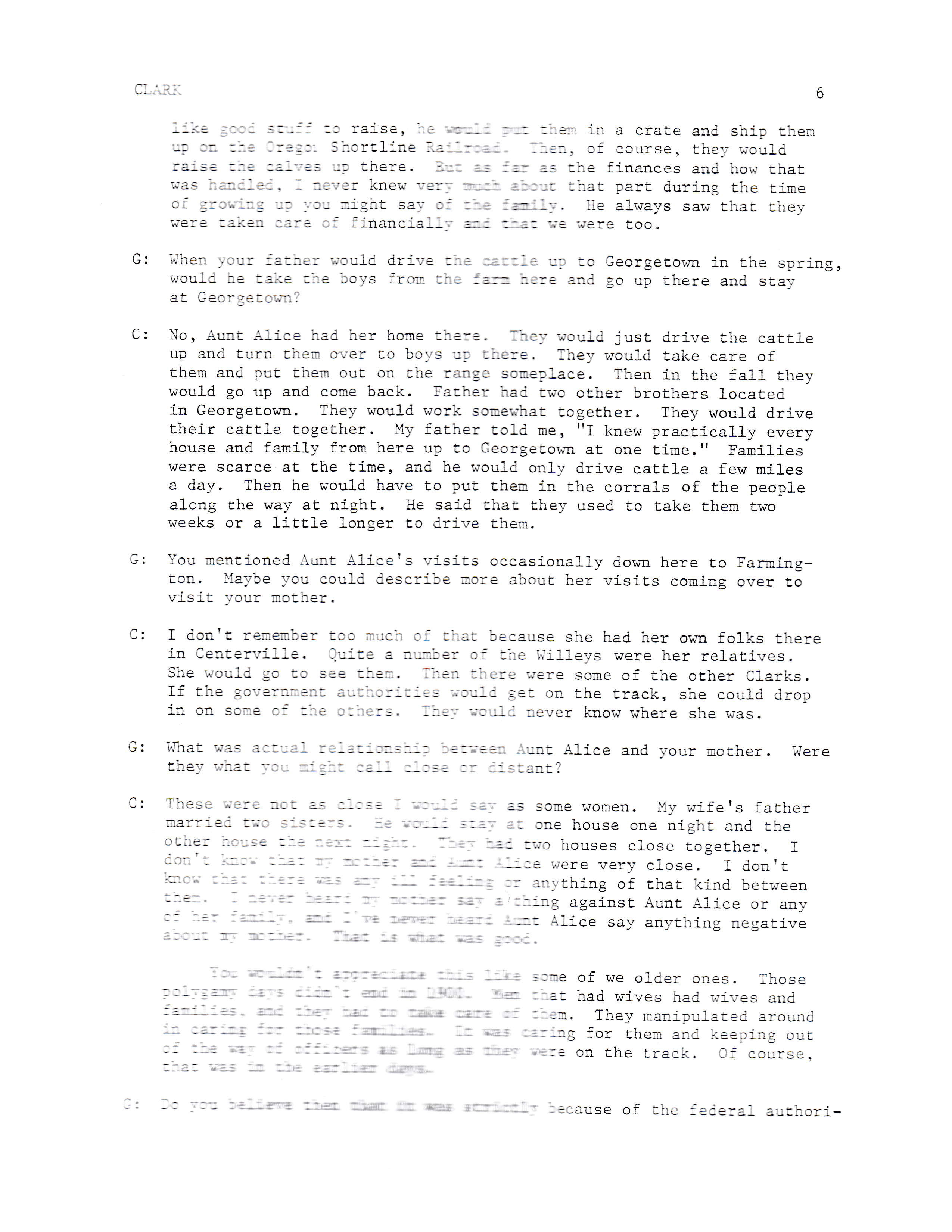 C: I don't remember too much of that because she had her own folks there in Centerville. Quite a number of the Willeys were her relatives. She would go to see them. Then there were some of the other Clarks. If the government authorities would get on the track, she could drop in on some of the others. They would never know where she was.