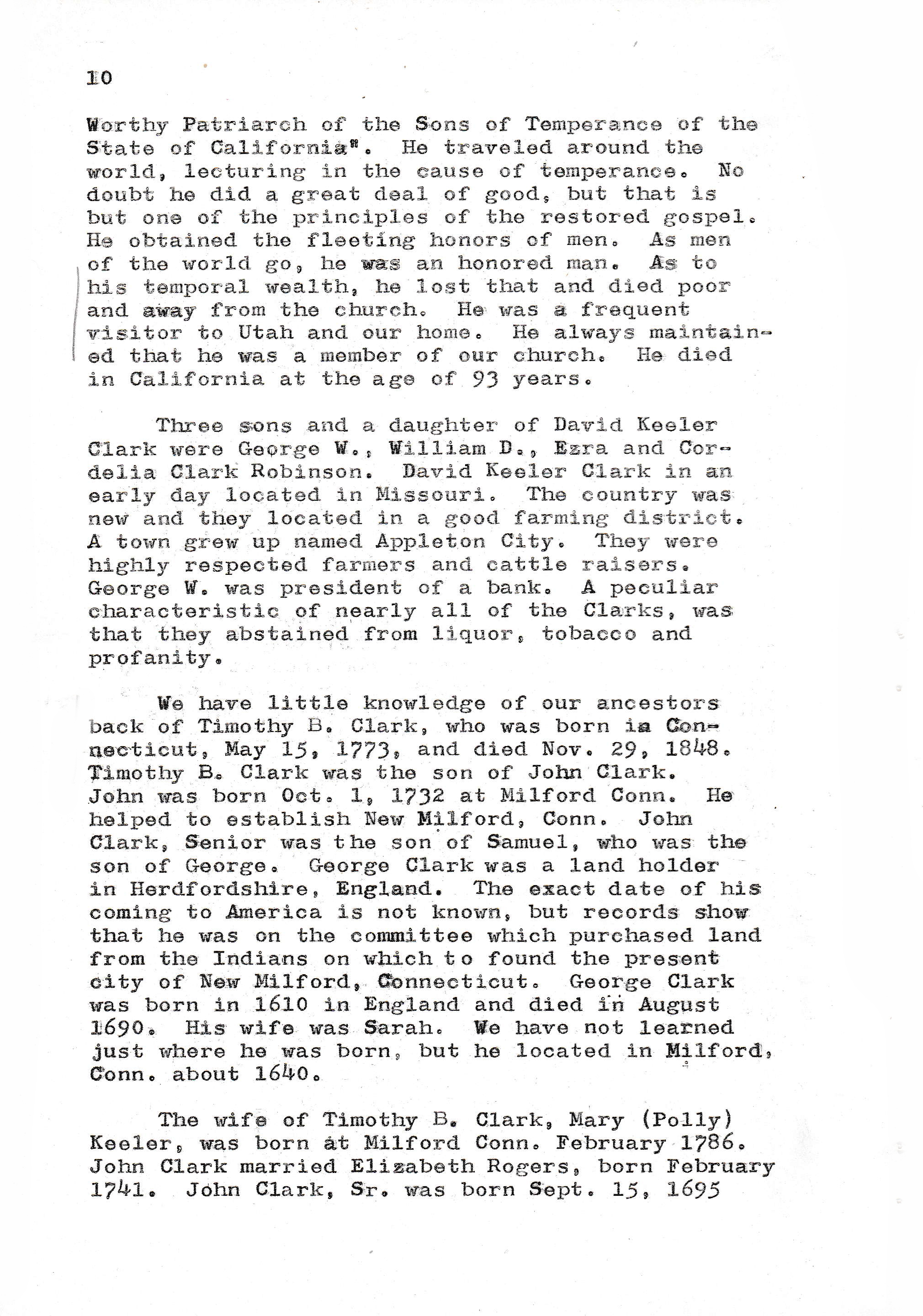 Three sons and a daughter of David Keeler Clark were George W., William D., Ezra and Cordelia Clark Robinson. David Keeler Clark in an early day located in Missouri. The country was new and they located in Missouri. The country was new and they located in a good farming district. A town grew up named Appleton City. They were highly respected farmers and cattle raisers. George W. was president of a bank. A peculiar characteristic of nearly all of the Clarks, was that they abstained from liquor, tobacco and profanity.