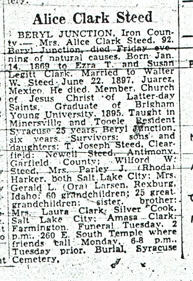BERYL JUNCTION, Iron County— Mrs. Alice CLark Steed, 92, Beryl Junction, died Friday evening of natural causes. Born Jan. 14, 1869 to Ezra T. and Susan Legitt Clark. Married to Walter W. Steed June 22. 1897, Jaurez, Mexico. He died. Member, Church of Jesus Christ of Latter-day Saints. Graduate of Brigham Young University, 1895. Taught in Minersville and Toole, Resident Syracuse 25 years. Beryl Junction. Six years, Survivors: sons and daughters: T. Joesph Steed, Clearfield: Newell Steed, Antimony, Garfield County: Wilford W: Steed, Mrs. Parley J. (Rhoda) Harker. both Salt Lake City: Mrs. Gerald L. (Ora) Larsen. Rexburg, Idaho: 60 grandchildren: 25 great grandchildren; sister, brother; Mrs. Laura Clark, Silver Cook, Salt lake City; Amsa Clark, Farmington. Funeral Tuesday, 2 p.m. 260 E. South Temple where friends call Monday. 6-8 p.m. Tuesday prior. Burial, Syracuse Cemetery.