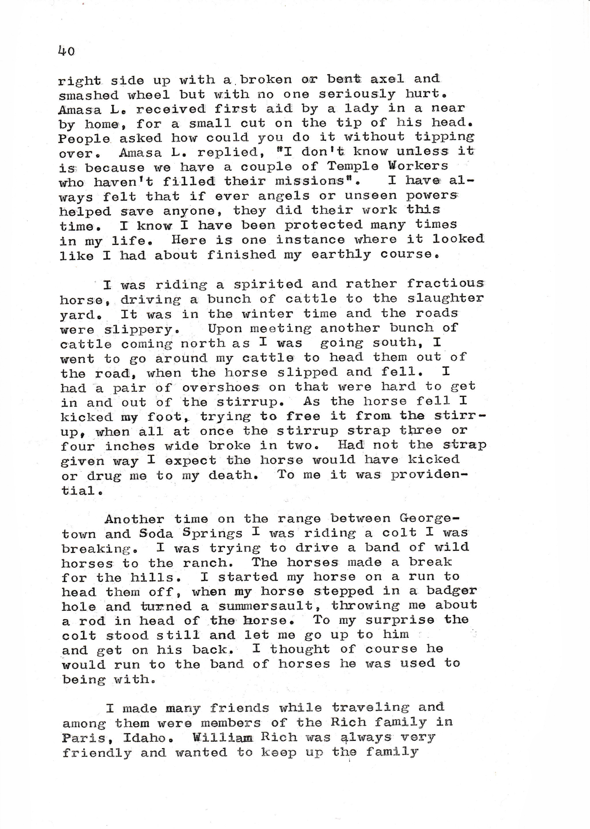 right side up with a broken or bent axel and smashed wheel but with no one seriously hurt. Amasa L. received first aid by a lady in a near by home, for a small cut on the tip of his head. People asked how could you do it without tipping over. Amasa L. replied, "I don't know unless it is because we have a couple of Temple Workers who haven't filled their missions". I have always felt that if ever angels or unseen powers helped save anyone, they did their work this time. I know I have been protected many times in my life. Here is one instance where it looked like I had about finished my earthly course.