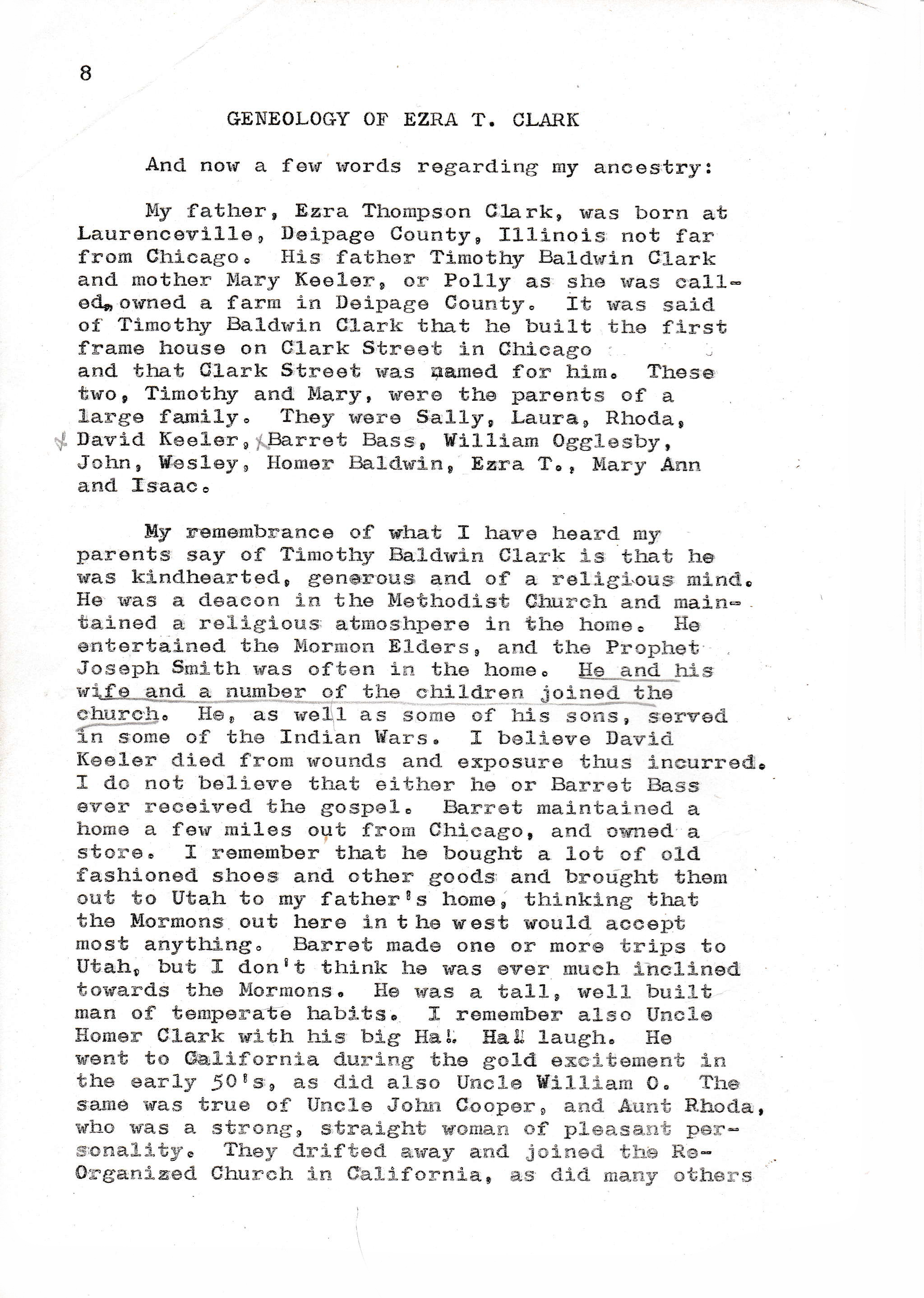 My remembrance of what I have heard my parents say of Timothy Baldwin Clark is that he was kindhearted, generous and of a religious mind. He was a deacon in the Methodist Church and maintained a religious atmosphere in the home. He entertained the Mormon Elders, and the Prophet Joseph Smith was often in the home. He and his wife and a number of the children joined the church. He, as well as some of his sons, served in some of the Indian Wars. I believe David Keeler died from wounds and exposure thus incurred. I do not believe that either he or Barrett Bass ever received the gospel. Barrett maintained a home a few miles out from Chicago, and owned a store. I remember that he bought a lot of old fashioned shoes and other goods and brought them out to Utah to my father's home, thinking that the Mormons out here in the west would accept most anything. Barrett made one or more trips to Utah, But I don't think he ever was much inclined towards the Mormons. He was a tall, well built man of temperate habits. I remember also Uncle Homer Clark with his big Ha! Ha! laugh. He went to California during the gold excitement in the early 50's, as did also Uncle William O. The same was true of Uncle John Cooper, and Aunt Rhoda, who was a strong, straight woman of pleasant personality. They drifted away and joined the Re-Organized Church in California, as did many others