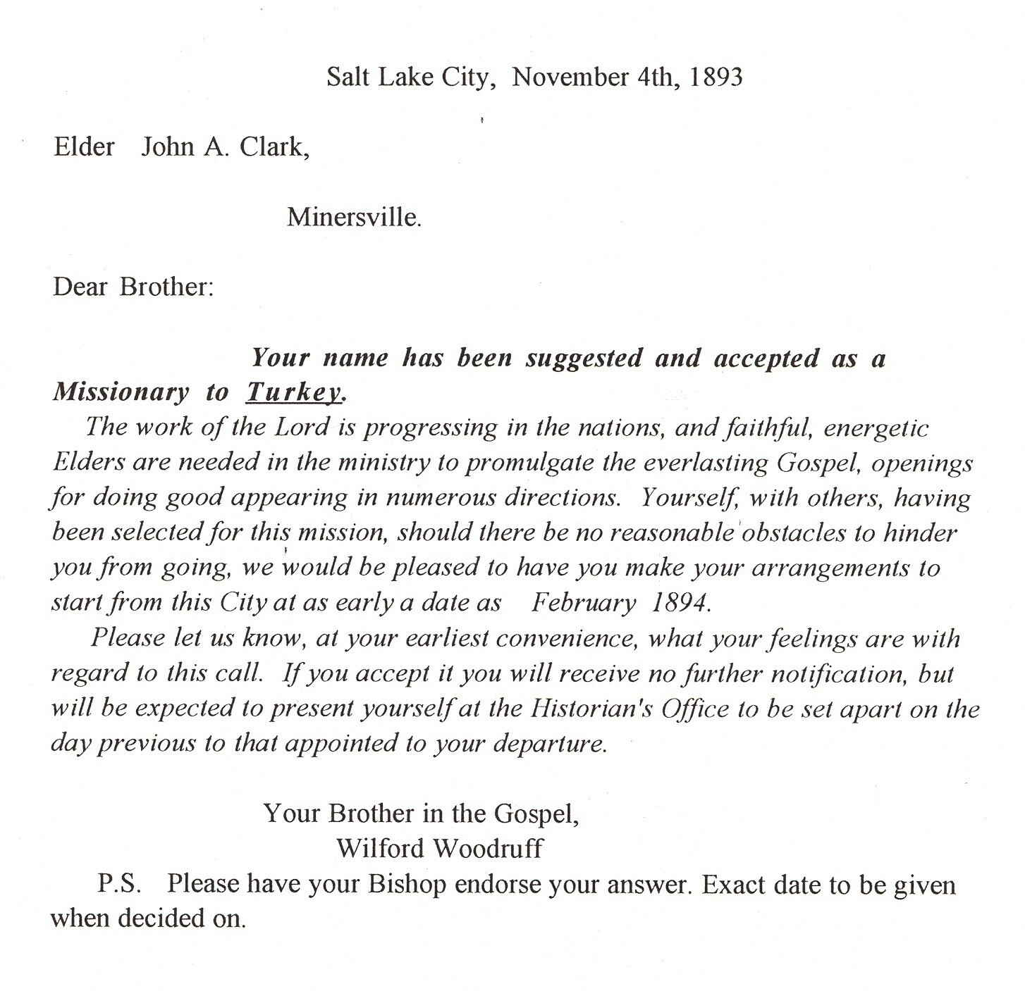The work of the Lord is progressing in the nations, and failthful, energetic Elders are needed in the ministry to promulgate the everlasting Gospel, openings for doing good appearing in numerous directions. Yourself, with others, having been selected for this mission, should there be no reasonable obstacles to hinder you from going, we would be pleased to have you make your arrangements to start from this City at as early a date as February 1894.