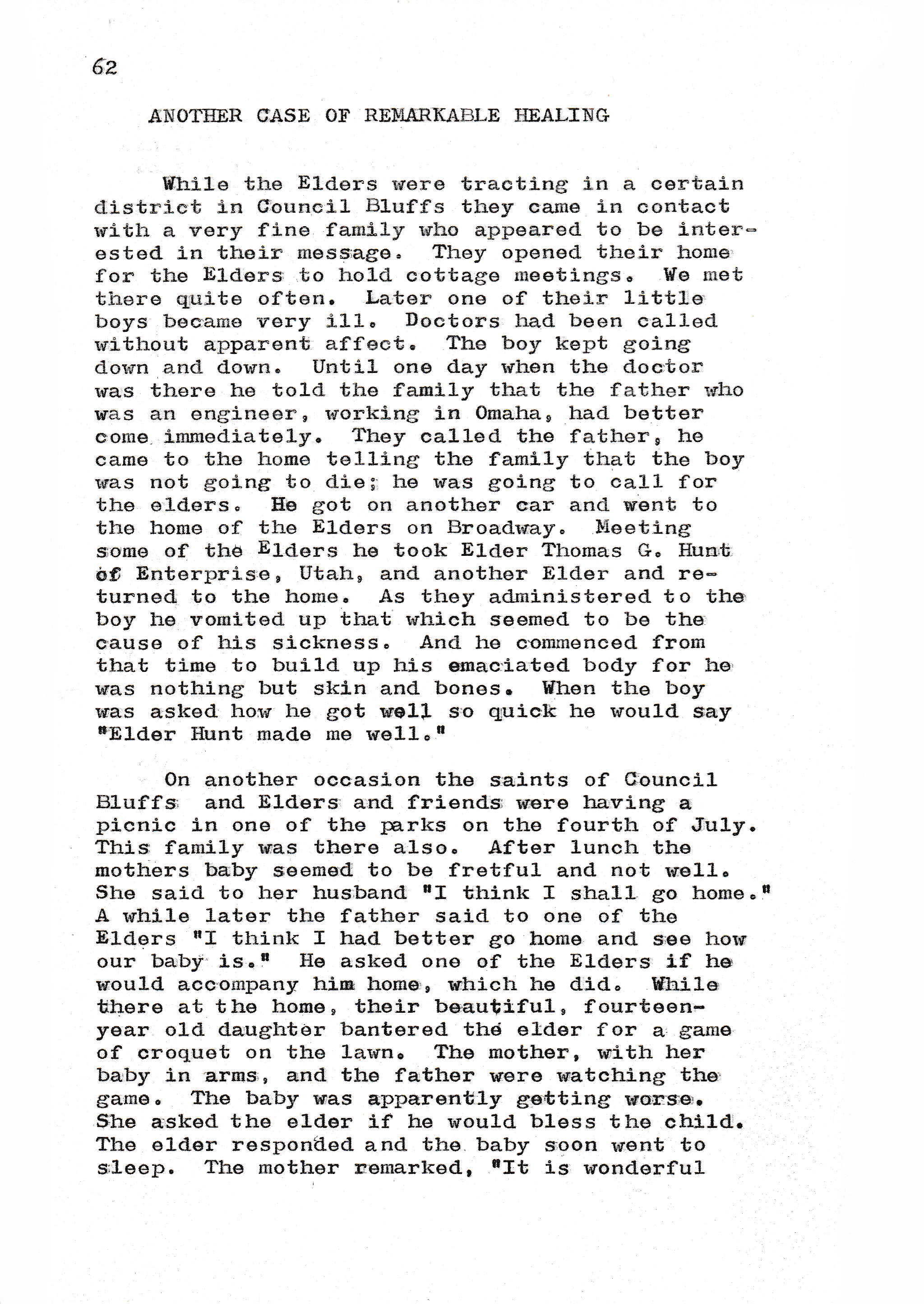 While the Elders were tracting in a certain district in Council Bluffs they came in contact with a very fine family who appeared to be interested in their message. They opened their home for the Elders to hold cottage meetings. We met there quite often. Later one of their little boys became very ill. Doctors had been called without apparent affect. The boy kept going down and down. Until one day when the doctor was there he told the family that the father who was an engineer, working in Omaha, had better come immediately. They called the father, he came to the home telling the family that the boy was not going to die; he was to call for the elders. He got on another car and went to the home of the Elders on Broadway. Meeting some of the Elders he took Elder Thomas G. Hunt of Enterprise, Utah, and another Elder and returned to the home. As they administered to the boy he vomited up that which seemed to be the cause of his sickness. And he commenced from that time to build up his emaciated body for he was nothing but skin and bones. When the boy was asked how he got well so quick he would say "Elder Hunt made me well."