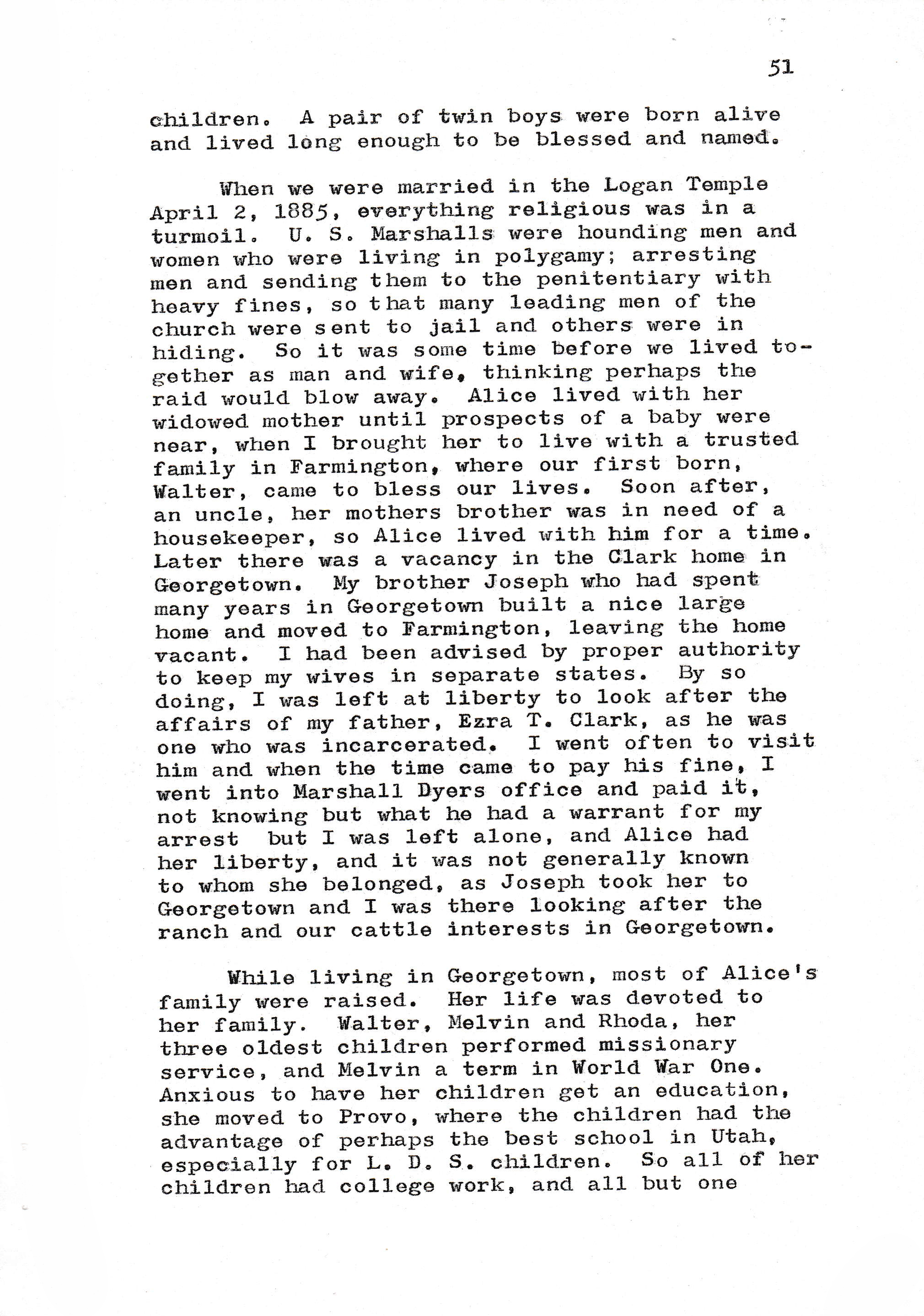 When we were married in the Logan Temple April 2, 1885, everything religious was in a turmoil. U.S. Marshalls were hounding men and women who were living in polygamy; arresting men and sending them to the penitentiary with heavy fines, so that many leading men of the church were sent to jail and others were in hiding. So it was some time before we lived together as man and wife, thinking perhaps the raid would blow away. Alice lived with her widowed mother until prospects of a baby were near, when I brought her to live with a trusted family in Farmington, where out first born, Walter, came to bless our lives. Soon after, an uncle, her mothers brother was in need of a housekeeper, so Alice lived with him for a time. Later there was a vacancy in the Clark home in Georgetown. My brother Joseph who had spent many years in Georgetown built a nice large home and moved to Farmington, leaving the home vacant. I had been advised by proper authority to keep my wives in separate states. By so doing, I was left at liberty to look after the affairs of my father, Ezra T. Clark, as he was one who was incarcerated. I went often to visit him and when the time came to pay his fine, I went into Marshall Dyers office and paid it, not knowing but what he had a warrant for my arrest but I was left alone, and Alice had her liberty, and it was not generally known to whom she belonged, as Joseph took her to Georgetown and I was there looking after the ranch and out cattle interests in Georgetown.