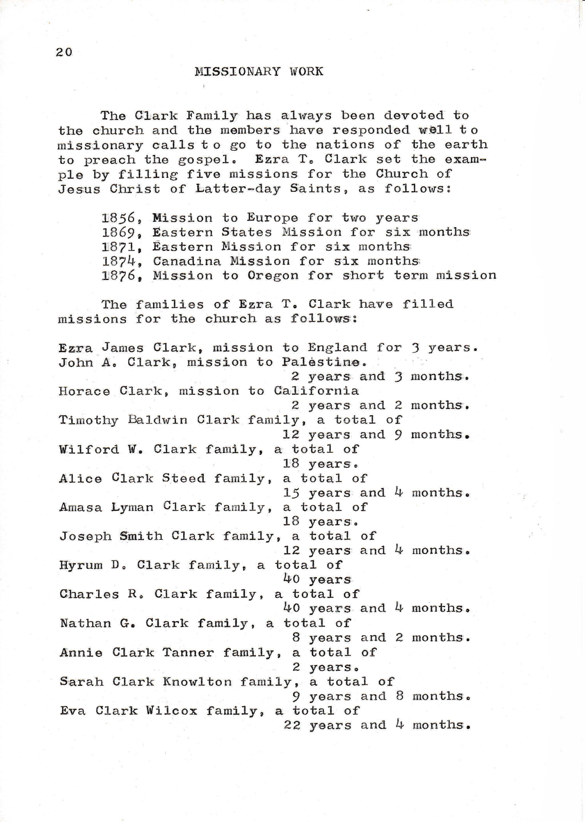 The families of Ezra T. Clark have filled mission for the church as follows: