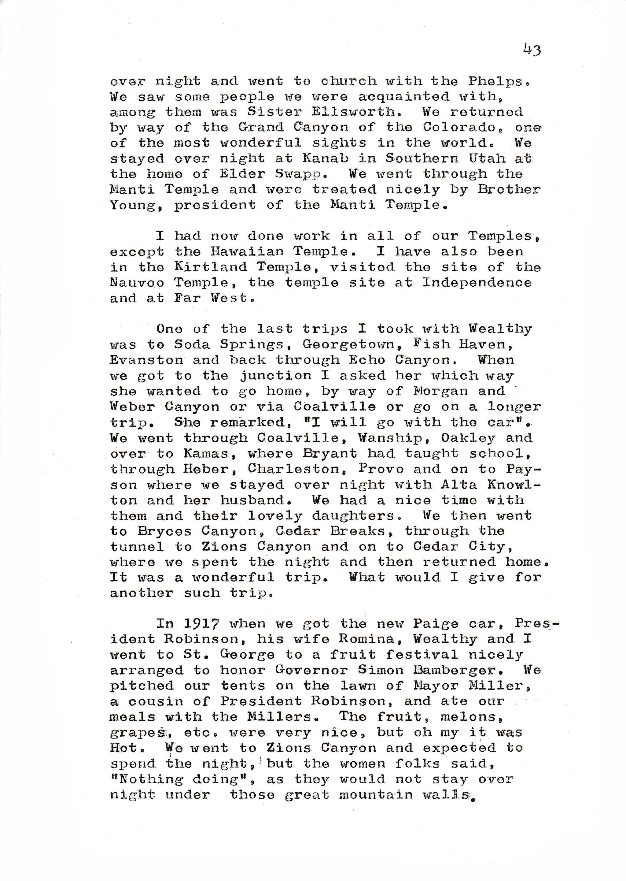 One of the last trips I took with Wealthy was to Soda Springs, Georgetown, Fish Haven, Evanston and back through Echo Canyon. When we got to the junction I asked her which way she wanted to go home. by way of Morgan and Weber Canyon or via Coalville or go on a longer trip. She remarked, "I will go with the car". We went through Coalville, Wanship, Oakley and over Kamas, where Bryant had taught school, through Heber, Charleston, Provo and on to Payson where we stayed over night with Alta Knowlton and her husband. We had a nice time with them and their lovely daughters. We then went to Bryce's Canyon, Cedar Breaks, through the tunnel to Zions Canyon and on to Cedar City, where we spent the night and then returned home. It was a wonderful trip. What would I give for another such trip.