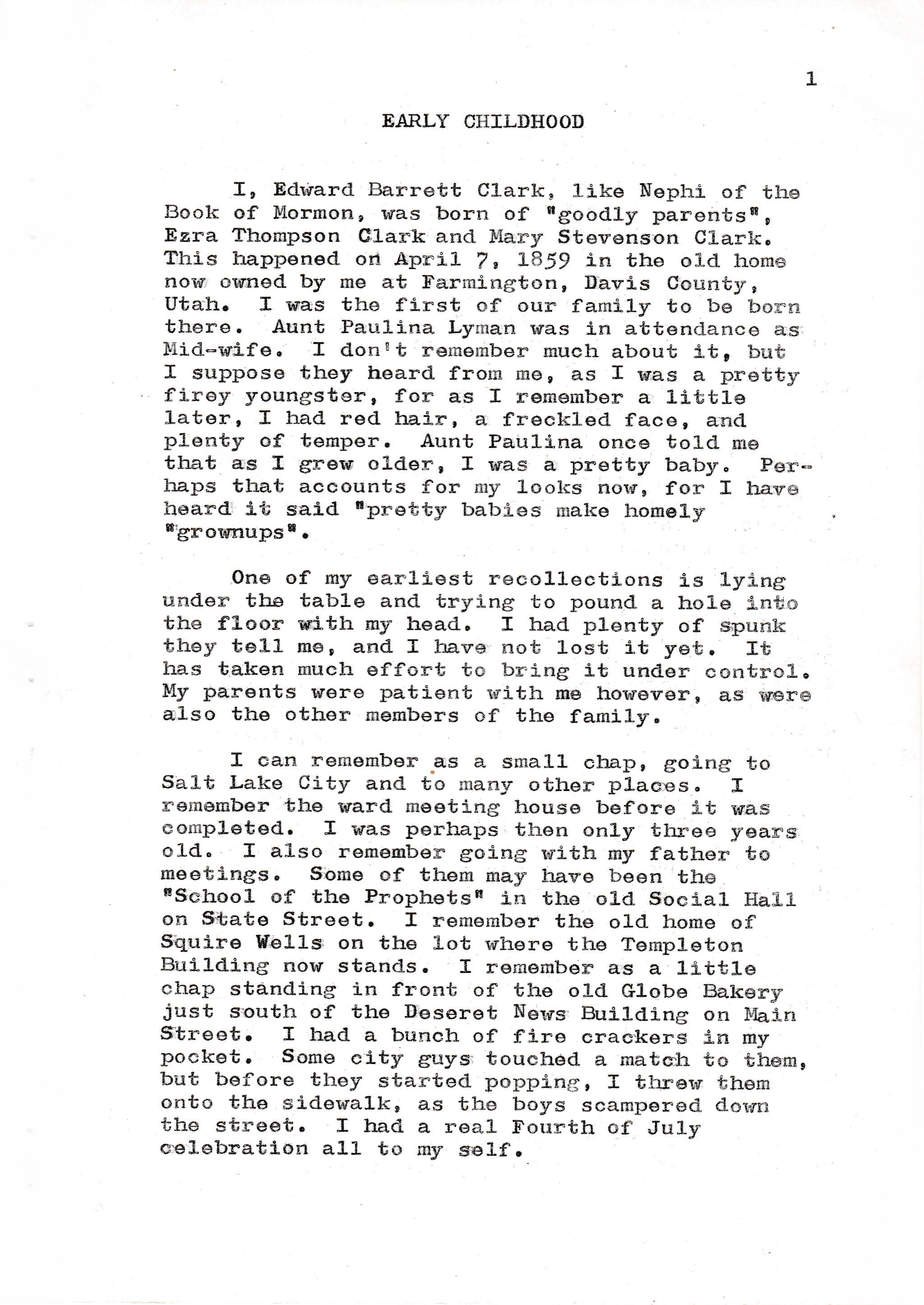 I, Edward Barrett Clark, like Nephi of the Book of Mormon, was born of "goodly parents", Ezra Thompson Clark and Mary Stevenson Clark. This happened on April 7, 1859 in the old home now owned by me at Farmington, Davis County, Utah. I was the first of our family to be born there. Aunt Paulina Lyman was in attendance as Mid-wife. I don't remember much about it, but I suppose they heard from me, as I was a pretty firey youngster, for I remember a little later, I had red hair, a freckled face, and plenty of temper. Aunt Paulina once told me that as I grew older, I was a pretty baby. Perhaps that accounts for my looks now, for I have heard it said "pretty babies make homely "grownups".