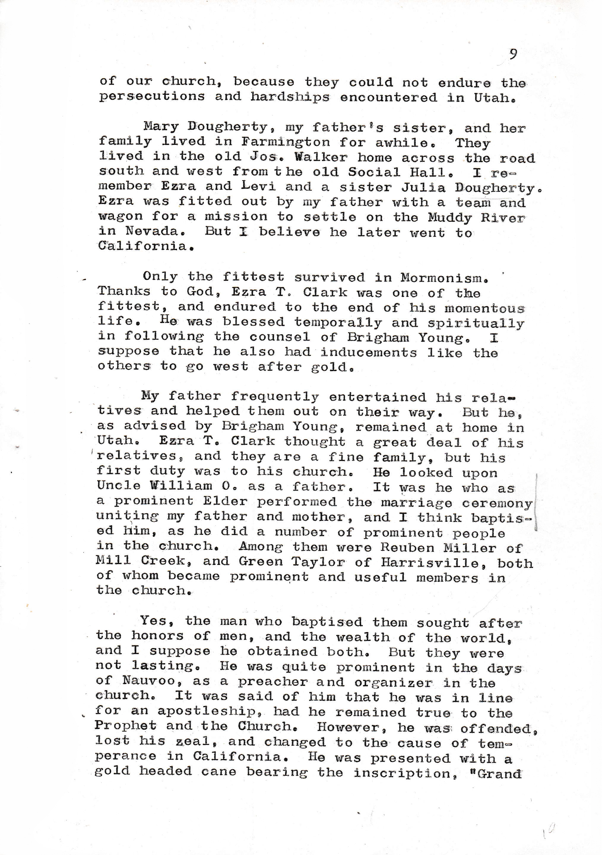 Mary Dougherty, my father's sister, and her family lived in Farmington for awhile. They lived in the old Jos. Walker home across the road south and west from the old Social Hall. I remember Ezra and Levi and a sister Julia Dougherty. Ezra was fitted out by my father with a team and wagon for a mission to settle on the Muddy River in Nevada. But I believe he later went to California.