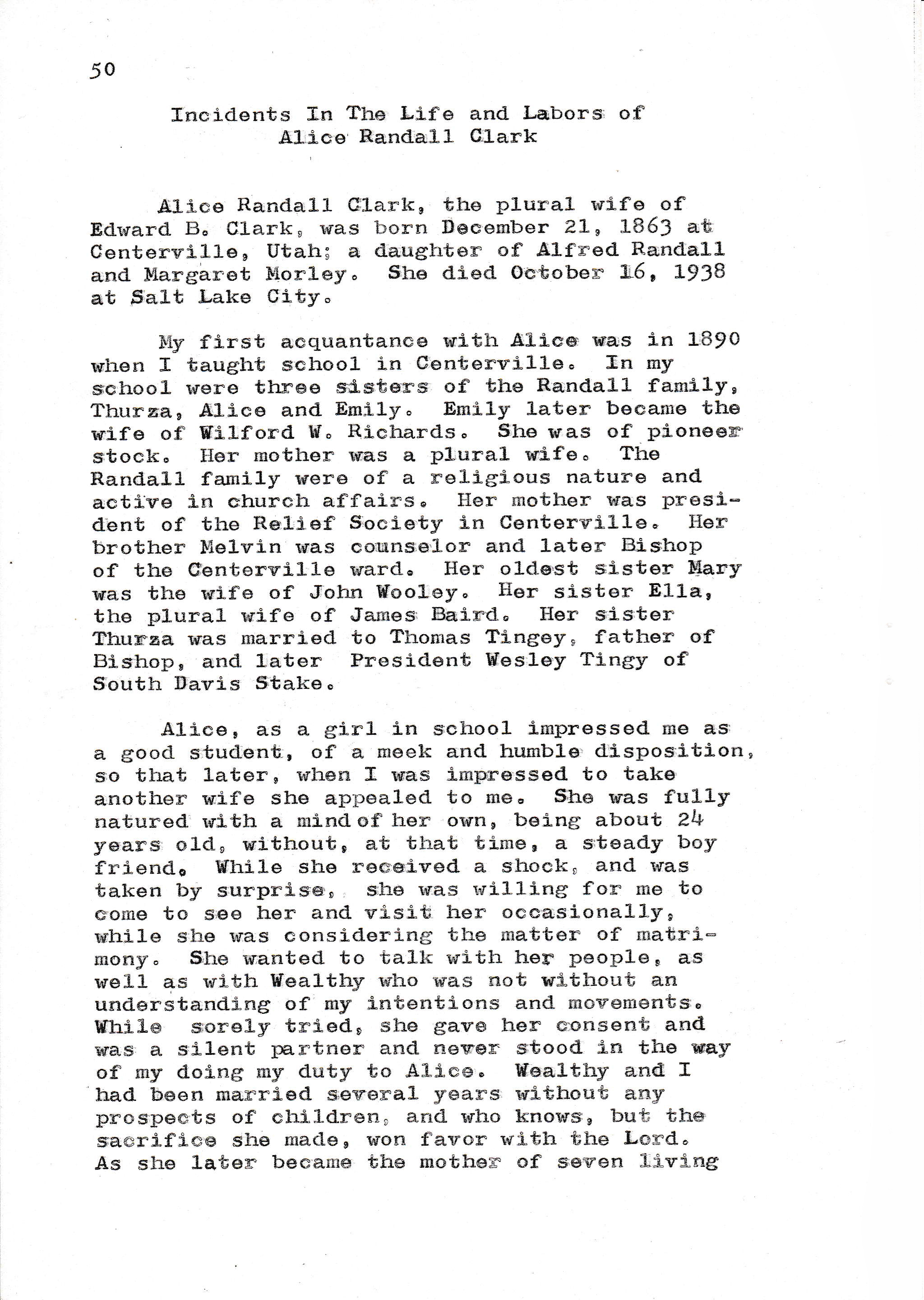My first acquaintance with Alice was in 1890 when I taught school in Centerville. In my school were three sisters of the Randall family, Thurza, Alice and Emily. Emily later became the wife of Wilford W. Richards. She was of pioneer stock. Her mother was a plural wife. The Randall family were of a religious nature and active in church affairs. Her mother was president of the Relief Society in Centerville. Her brother Melvin was counselor and later Bishop of the Centerville ward. Her oldest sister Mary was the wife of John Wooley. her sister Ella, the plural wife of James Baird. Her sister Thurza was married to Thomas Tingey, father of Bishop, and later President Wesley Tingy of South Davis Stake.