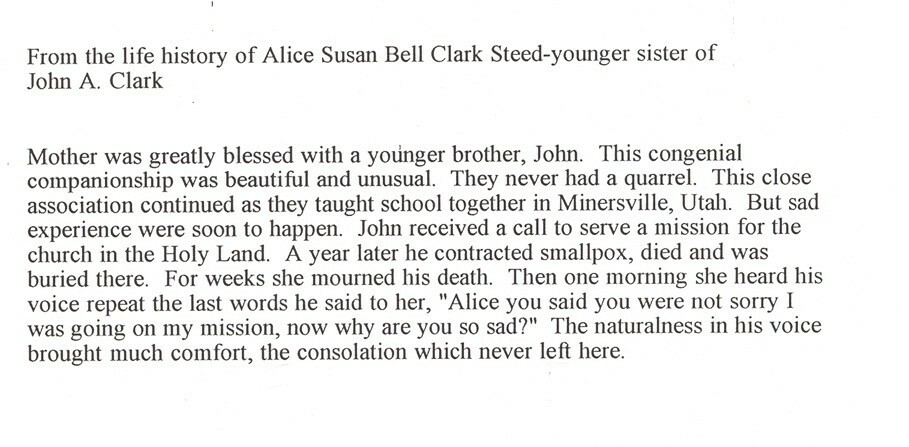 Mother was greatly blessed with a younger brother, John. This congenial companionship was beautiful and unusual. They never had a quarrel. This close association continued as they taught school together in Minersville, Utah. But sad experience were soon to happen. John received a call to serve a mission for the church in the Holy Land. A ear later he contracted smallpox, died and was buried there. For weeks she mourned his death. Then one morning she heard his voice repeat the last words he said to her, "Alice you said you were not sorry I was going on my mission, now why are you so sad?" The naturalness in his voice brought so much comfort, the consolation which never left here.