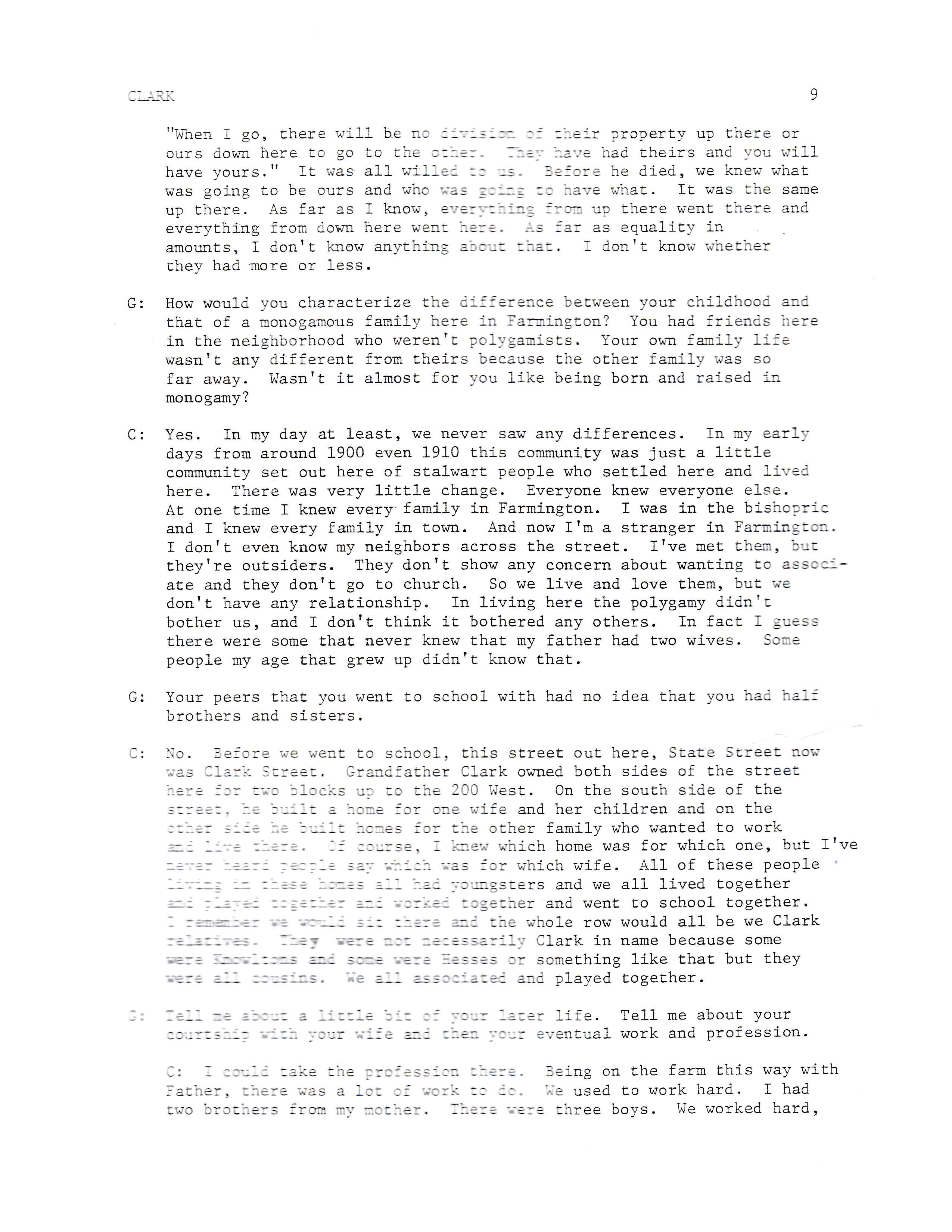 G: How would you characterize the difference between your childhood and that of a monogamous family here in Farmington? You had friends here in the neighborhood who weren't polygamists. Your own family life wasn't any different from theirs because the other family was so far away. Wasn't it almost for you like being born and raised in monogamy?