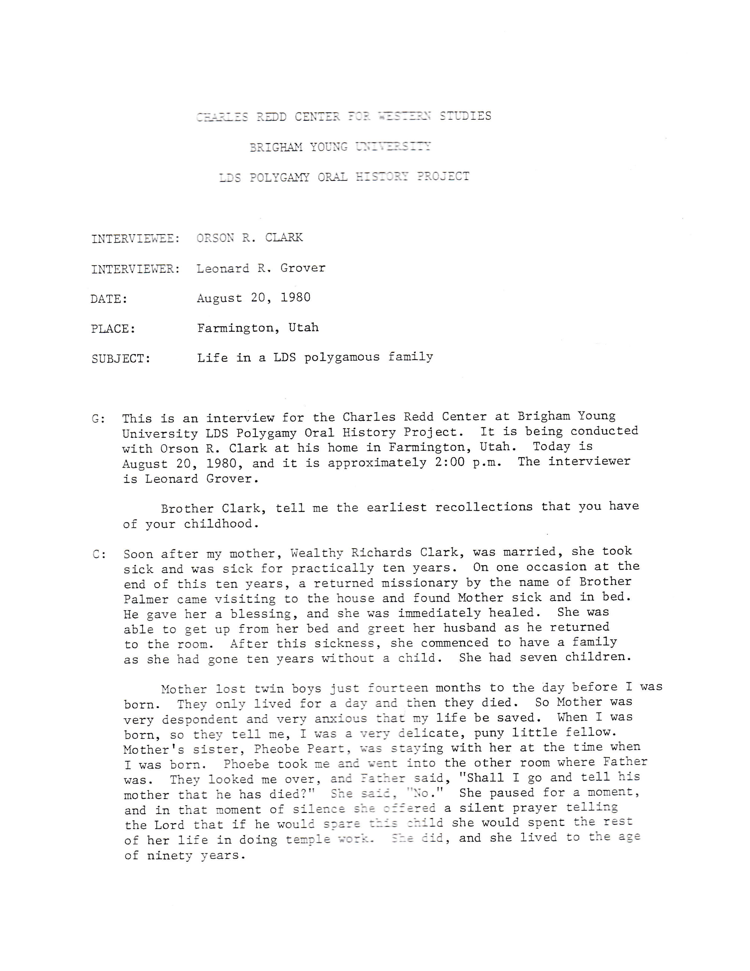 G: This is an interview for the Charles Redd Center at Brigham Young University LDS Polygamy Oral History Project. It is being conducted with Orson R. Clark at his home in Farmington, Utah. Today is August 20, 1980, and it is approximately 2:00 p.m. The interviewer is Leonard Grover.