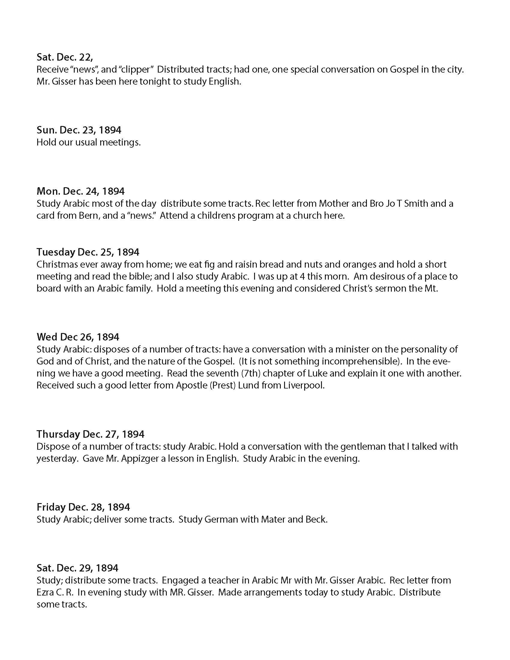 Sat Dec. 29, 1894 Study; distribute some tracts. Engaged a teacher in Arabic Mr with Mr. Gisser Arabic. Rec letter from Ezra C.R. In evening study with MR. Gisser. Made arrangements today to study Arabic. Distribute some tracts.