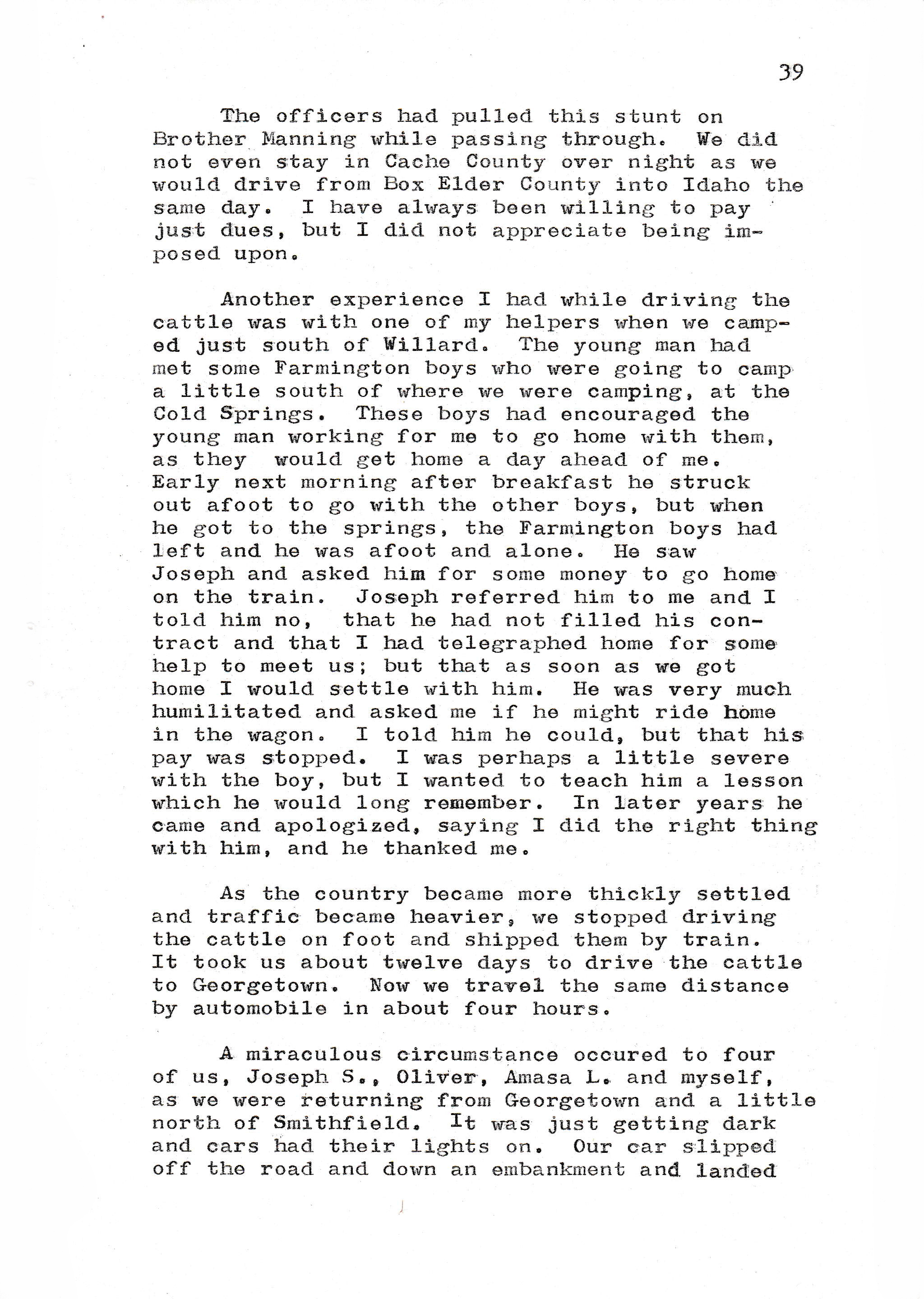 A miraculous circumstance occurred to four of us, Joseph S., Oliver, Amasa L. and myself, as we were returning from Georgetown and a little north of Smithfield. It was just getting dark and cars had their lights on. Our car slipped off the road and down an embankment and landed
