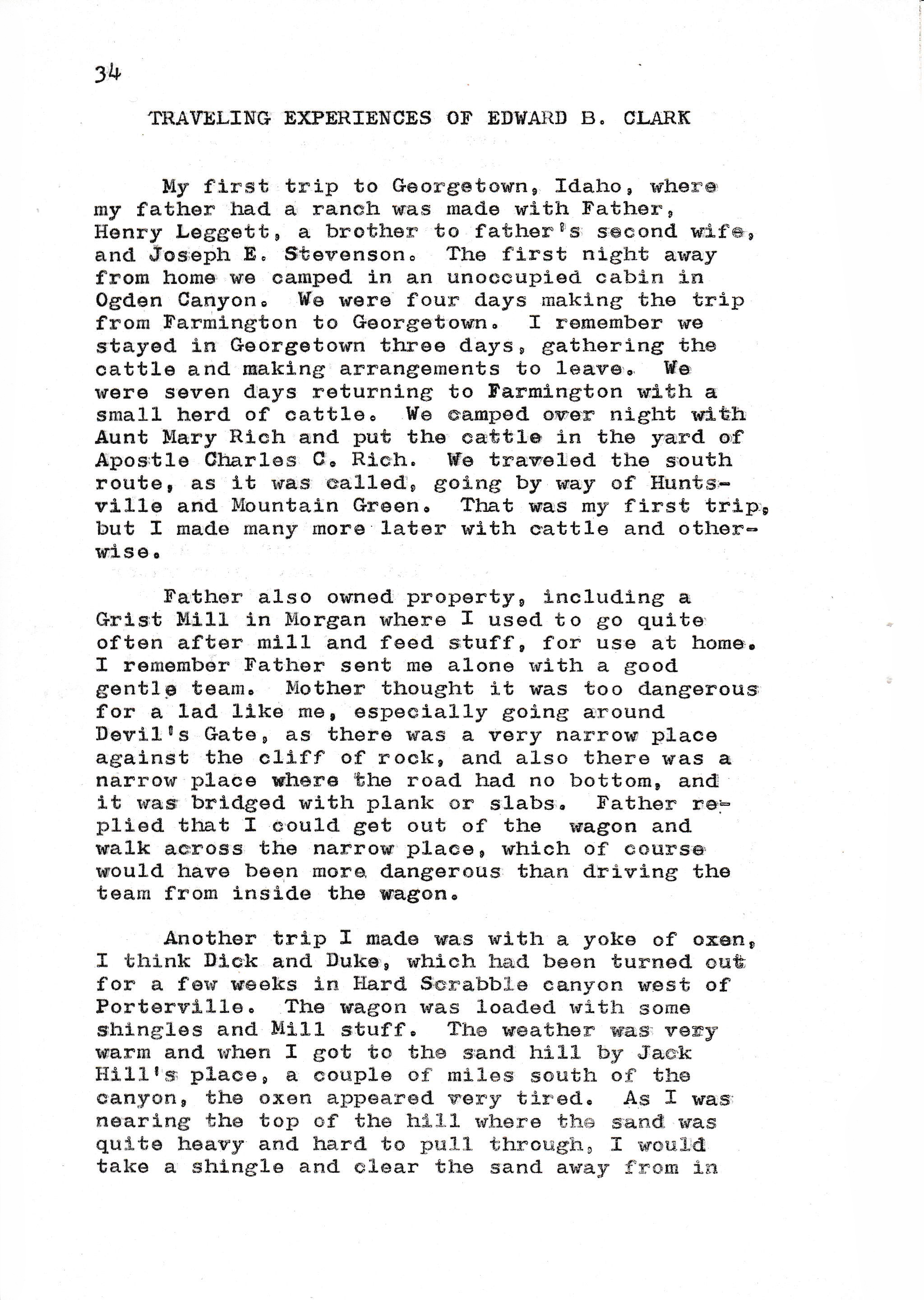 My first trip to Georgetown, Idaho, where my father had a ranch was made with Father, Henry Leggett, a brother to father's second wife, and Joseph E. Stevenson. The first night away from home we camped in an unoccupied cabin in Ogden Canyon. We were four days making the trip from Farmington to Georgetown. I remember we stayed in Georgetown three days, gathering the cattle and making arrangements to leave. We were seven days returning to Farmington with a small herd of cattle. We camped over night with Aunt Mary Rich and put the cattle in the yard if Apostle Charles C. Rich. We traveled the south route, as it was called, going by way of Huntsville and Mountain Green. That was my first trip, but I made many more later with cattle and otherwise.