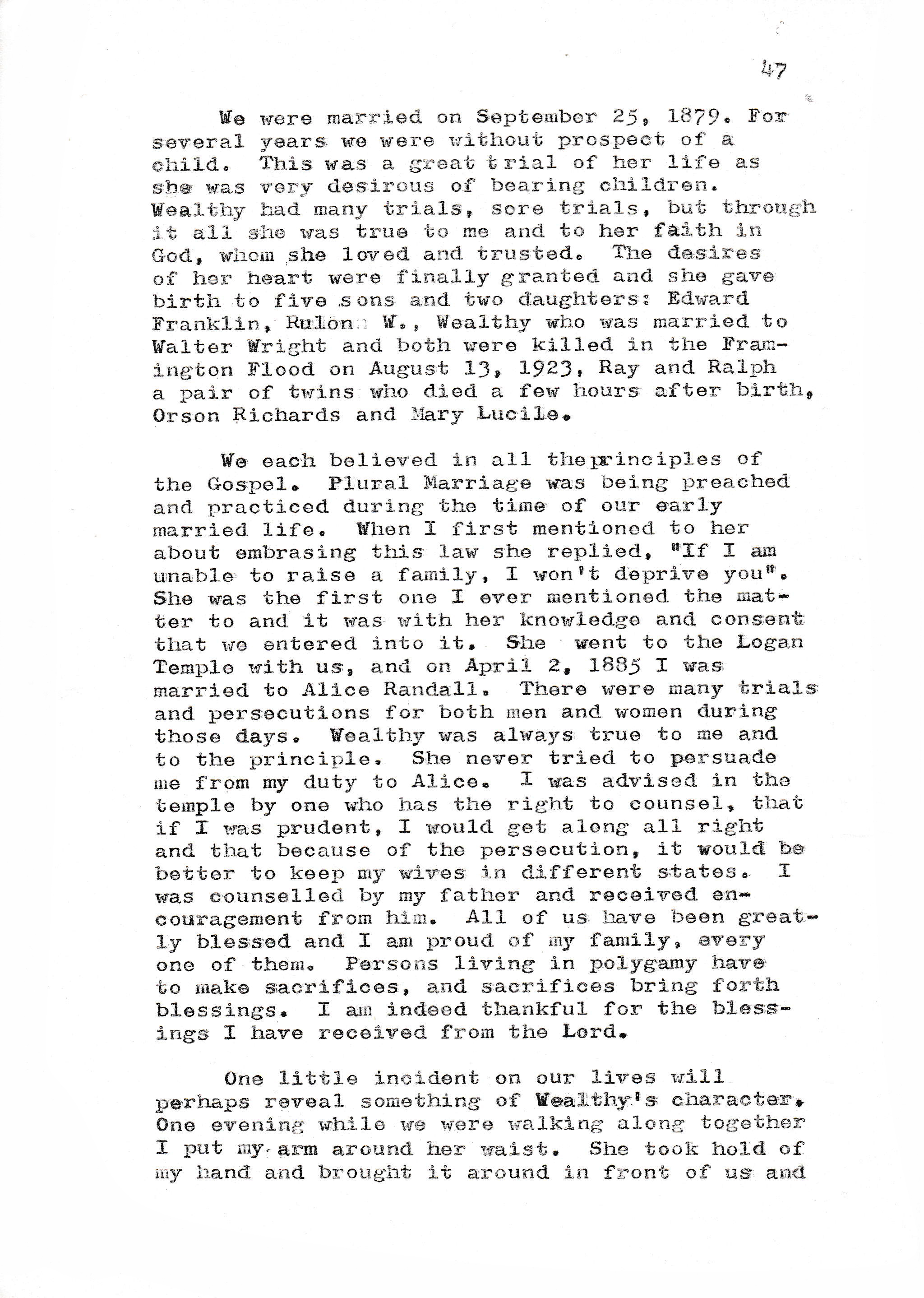 We were married on September 25, 1879. For several years we were without prospect of a child. This was a great trial of her life as she was very desirous of bearing children. Wealthy had many trials, sore trials, but through it all she was true to me and to her faith in God, whom she loved and trusted. The desires of her heart were finally granted and she gave birth to five sons and two daughters: Edward Franklin, Rulon W., Wealthy who was married to Walter Wright and both were killed in the Farmington Flood on August 13, 1923, Ray and Ralph a pair of twins who died a few hours after birth, Orson Richards and Mary Lucile.